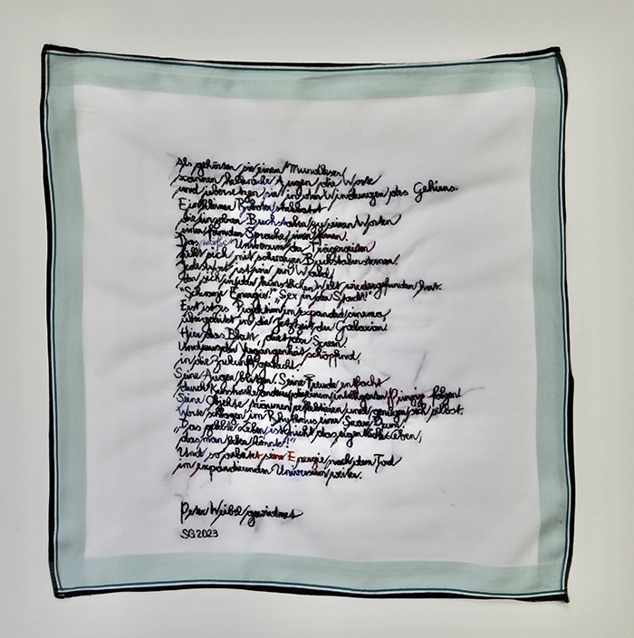 eigene lyrik von hand gestickt auf stofftaschentücher verschiedenster provenienz