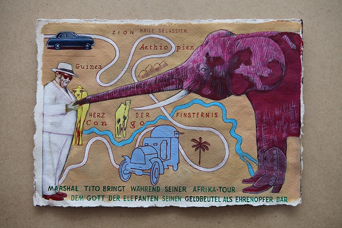 der in berlin lebende bildende künstler und musiker patrick pilsl alias martin dean verstärkt saids kritik am kolonialen weltbild indem er sie affirmativ zuspitzt bis hin zu einer karikativen übertreibung, in der die “erste welt” als genau das auftritt, was sie für die zweite, dritte und vierte welt augenscheinlich ist: ein brutales, allesverschlingendes monster, das über grenzen und leichen geht. dass martin deans obskure landkarten und globen bei aller kritik am kolonialismus und kapitalismus oft auch noch komisch sind, verdankt sich dem schwarzen, ja grimmig bösen humor des künstlers.