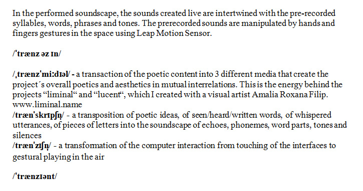 zuzana husárová is a postdoc scholar and author in the field of electronic literature, teaching at comenius university (sr) and masaryk university (cz), an ex-fulbright scholar at MIT, usa (2011). she is the author of experimental literature across various media, has created sound poetry, interactive digital poetry and transmedia poetry. she has collaborated with lubomír panák on interactive literary pieces (Enter: in’ Wodies, I: *ttter, BA-Tale, Pulse). she co-authored with amalia roxana filip transmedia projects liminal and lucent (visual poetry books, sound poetry and live performances www.liminal.name), has collaborated with four artists on a multimedia performance phenomena research. zuzana husárová co-edited with bogumiła suwara a publication on electronic literature research V sieti strednej Európy: nielen o elektronickej literatúre and with martin solotruk a project about contemporary european poetry: european poetry forum (http://poetryforum.arspoetica.sk).