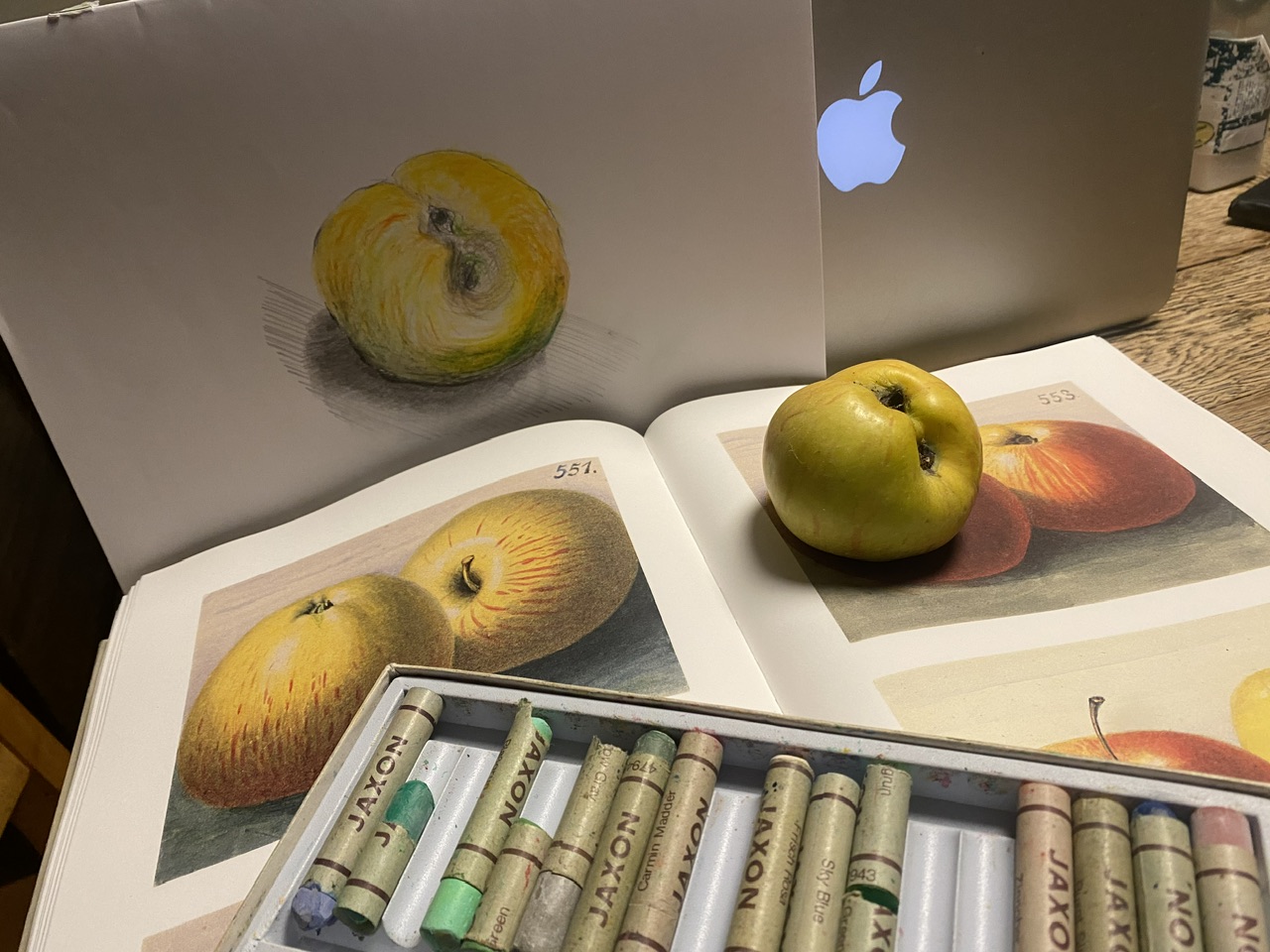 na, bitte. so viel material und ein apfel und ein apple und ein geschwisterapfel zu meinem bei der kursbeschreibung und den korbinian. also bitte, ich bin begeistert! so, und jetzt das ewige feilen, also: