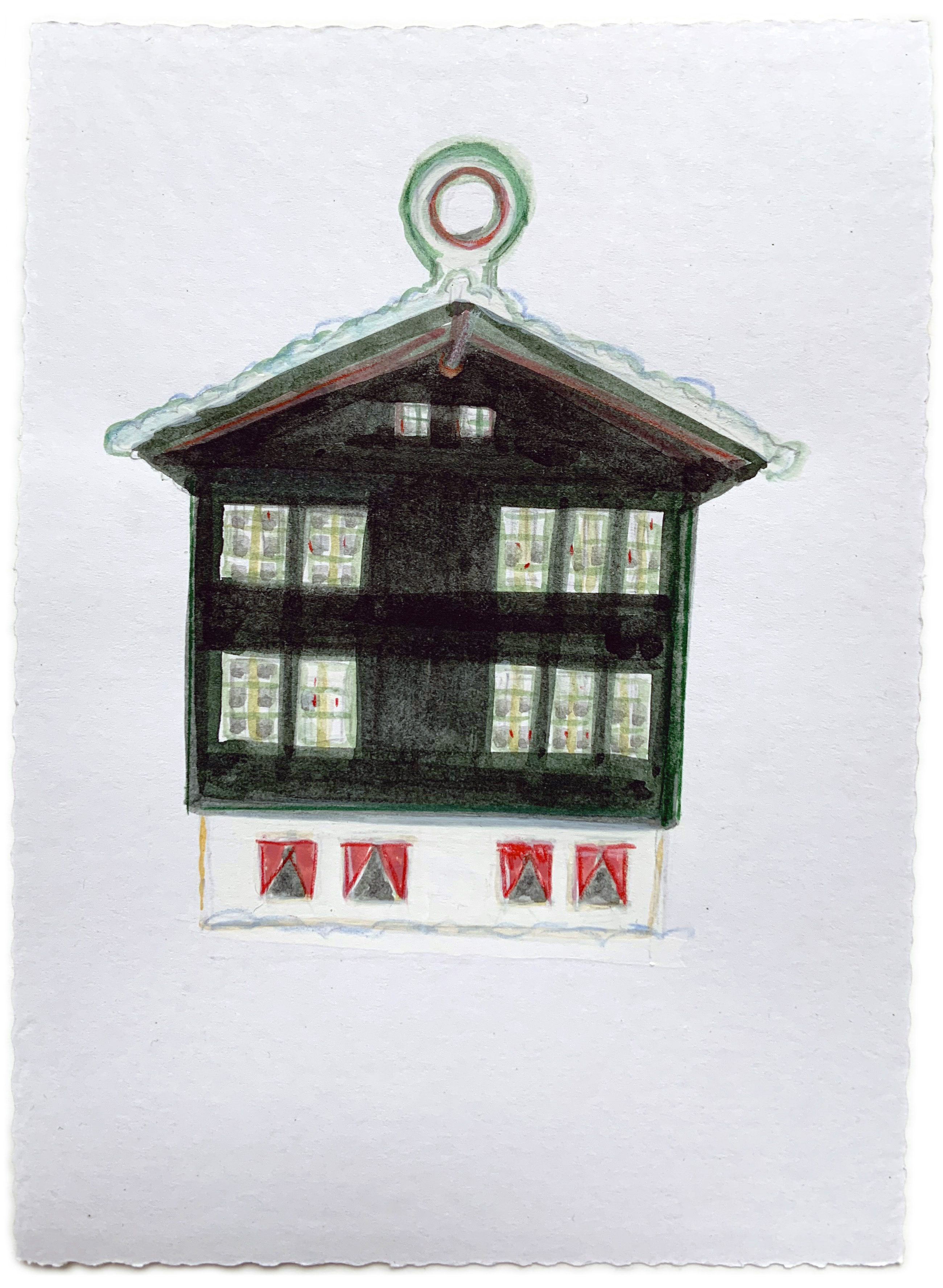 Bild: Teresa Präauer: Wham-Chalet zum Ausdrucken (in Größe A6 mit 300 dpi). Gedrucktes Chalet auf einen Karton kleben, ausschneiden, lochen und Band durchfädeln – fertig ist der Adventanhänger des Grauens für das Tannenzweigerl des blanken Entsetzens.