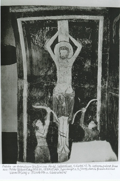 - überraschend: Sebastian, dieser frühe europäische Heilige des 3./4. Jhs. (aus Narbonne oder Milano stammend) soll erst in der Renaissance bildlich zu der uns bekannten Form als gepfeilter Jüngling gefunden haben (eben: auf diesem LateranFresko des 12. Jhs sind die Pfeile zwar auf ihn gerichtet, aber noch nicht abgeschossen): und dergestalt von den Pfeilen der Infektion durchbohrt, im VollRelief fixiert, war er etwa jahrelang an der Außenwand der Bürgerspitalskirche der Salzburger Altstadt am Ende der Getreidegasse zu sehen, bis man diese Darstellung (wohin wohl? eben:) nach St. Sebastian in der Linzergasse (Neustadt) transferiert hat, wo auch der Arzt und Alchemist Theophrast Bombast seine letzte Ruhestätte gefunden hat und wo Trakl in der Engel-Apotheke als Medikamentenakzessist tätig war, sein düsteres Gedicht Sebastian im Traum (Adolf Loos gewidmet) endet so:
