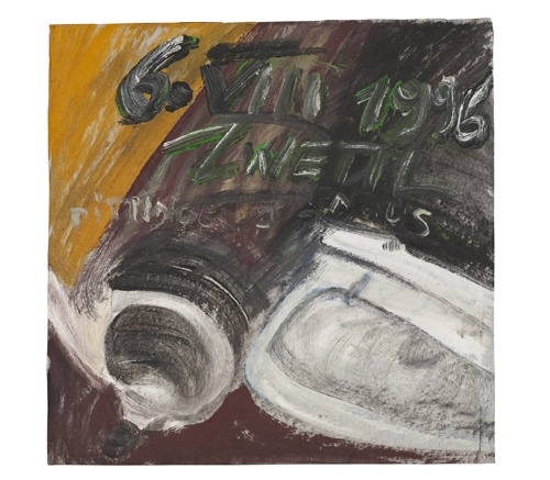 das 1. Bild von 1996 (die eine Animiertheit für Friederike Mayröcker) stellt einen menschenleeren Landschaftsausschnitt mit einem Schlängelweg zu einer roten Bank an einem Rundbassin dar, das 2. Bild (die zweite Animiertheit für die Dichterin) rückt ausschnitthaft weiße Sanitärkeramik ins Bild, beide Tageszeichnungen sind mit Stift und Pinsel datiert und tragen halbleserliche Aufschriften, die dann in der Textbearbeitung aufgegriffen werden (im einen Fall auch als sogenannte Ver-Lesung: PHÖBUS steht über dem Abtritt, heißt es bei Mayröcker, Dittinger ziehen aus, sollte das heißen und steht dort schwer leserlich in Pinselschrift hingeschrieben, erklärt auf Nachfrage Linde Waber), auch war die Künstlerin nicht gemeinsam mit der Dichterin im Knappenhof über Edlach an der Rax, sondern Linde Waber hat sich mit ihrem Mann Istvan Szikszay damals in diesem Gebirgshotel einquartiert, die Lebens-Erzählungen und Eindrücke der Autorin als junger Frau im Hinterkopf