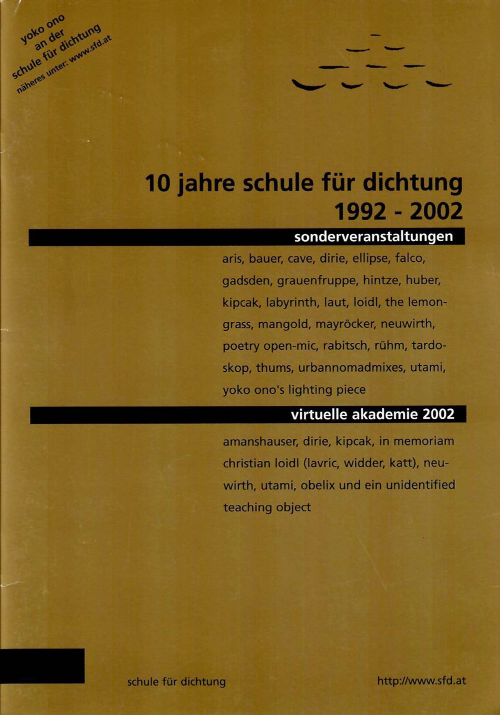 - eine reihe von sonderveranstaltungen: arbeiten unserer lehrer, arbeiten unserer studenten, "der andere falco", "nick cave in concert", "sexueller masochismus in der literatur", "in memoriam christian loidl" und widmen es der von der somalischen autorin waris dirie gegründeten stiftung "desert dawn", die sich gegen die verstümmelung weiblicher sexualorgane wendet. waris dirie wird sich persönlich ihrem publikum stellen und im rahmen unserer "virtuellen akademie 2002" eine internetklasse leiten.